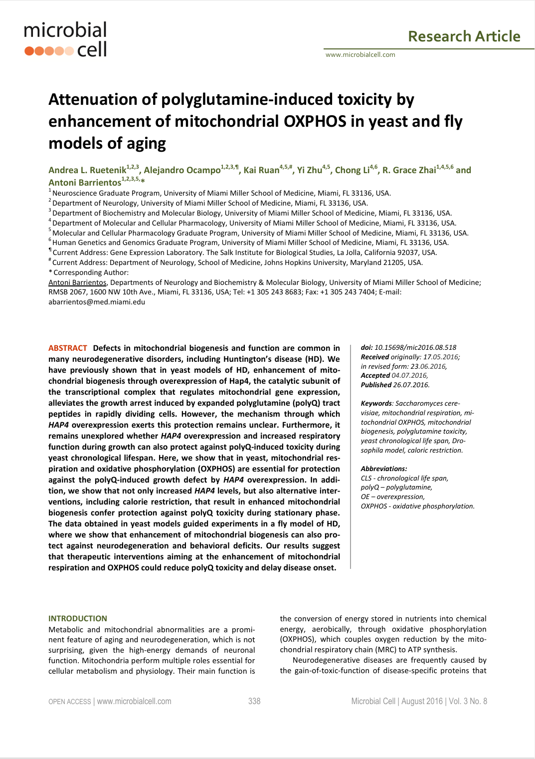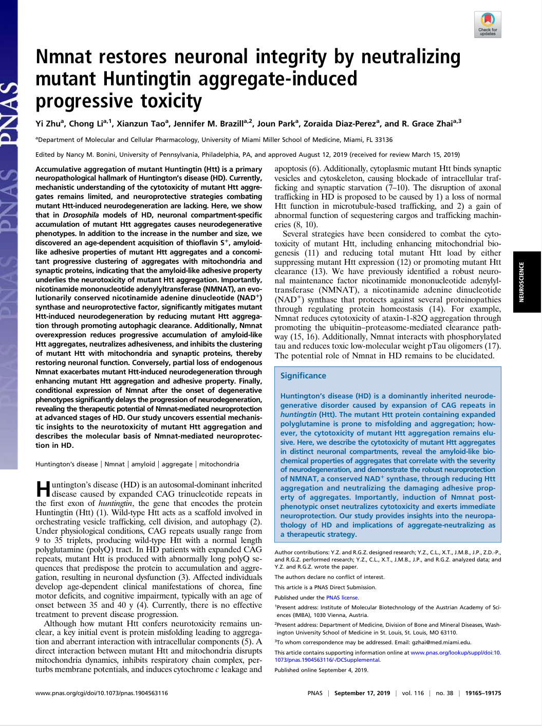 Zhu Y, Li C, Tao X, Brazill JM, Park J, Diaz-Perez Z, Zhai RG (2019) Nmnat restores neuronal integrity by neutralizing mutant Huntingtin aggregate-induced progressive toxicity. PNAS, 116 (38), 19165-19175