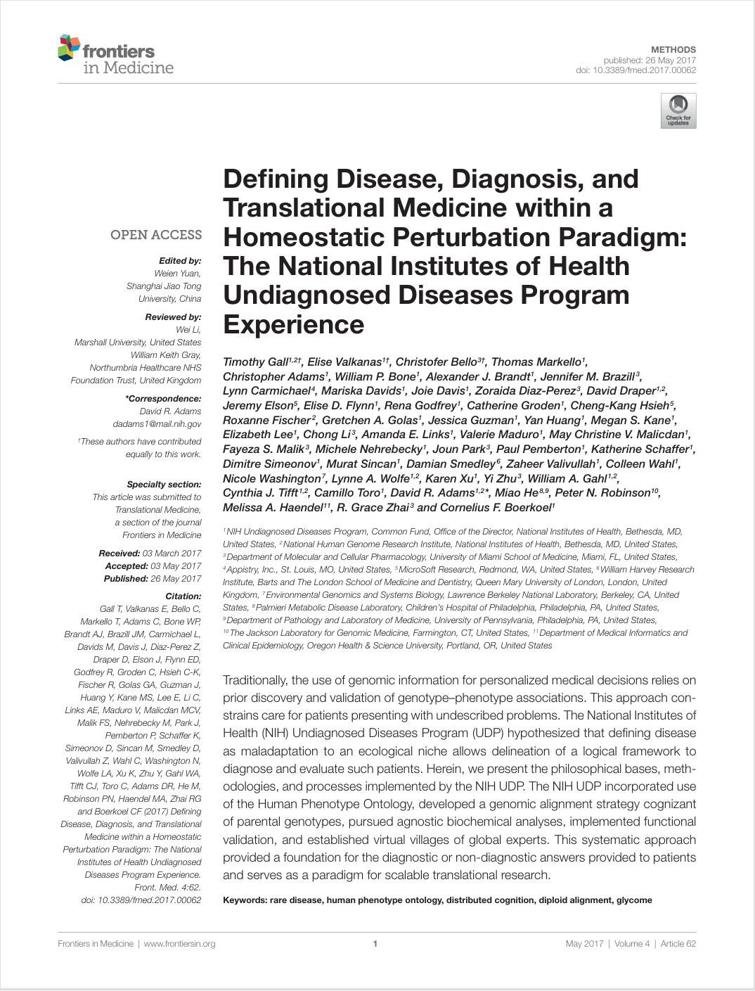 Gall T, Valkanas E, Bello C, Markello T, Adams C, Bone WP, Brandt AJ, Brazill JM, Carmichael L, Davids M, Davis J, Diaz-Perez Z, Draper D, Elson J, Flynn ED, Godfrey R, Groden C, Hsieh C-K, Fischer R, Golas GA, Guzman J, Huang Y, Kane MS, Lee E, Li C, Links AE, Maduro V, Malicdan MCV, Malik FS, Nehrebecky M, Park J, Pemberton P, Schaffer K, Simeonov D, Sincan M, Smedley D, Valivullah Z, Wahl C, Washington N, Wolfe LA, Xu K, Zhu Y, Gahl WA, Tifft CJ, Toro C, Adams DR, He M, Robinson PN, Haendel MA, Zhai RG and Boerkoel CF (2017) Defining disease, diagnosis, and translational medicine within a homeostatic perturbation paradigm: The NIH Undiagnosed Diseases Program experience. Front. Med., 4:62.