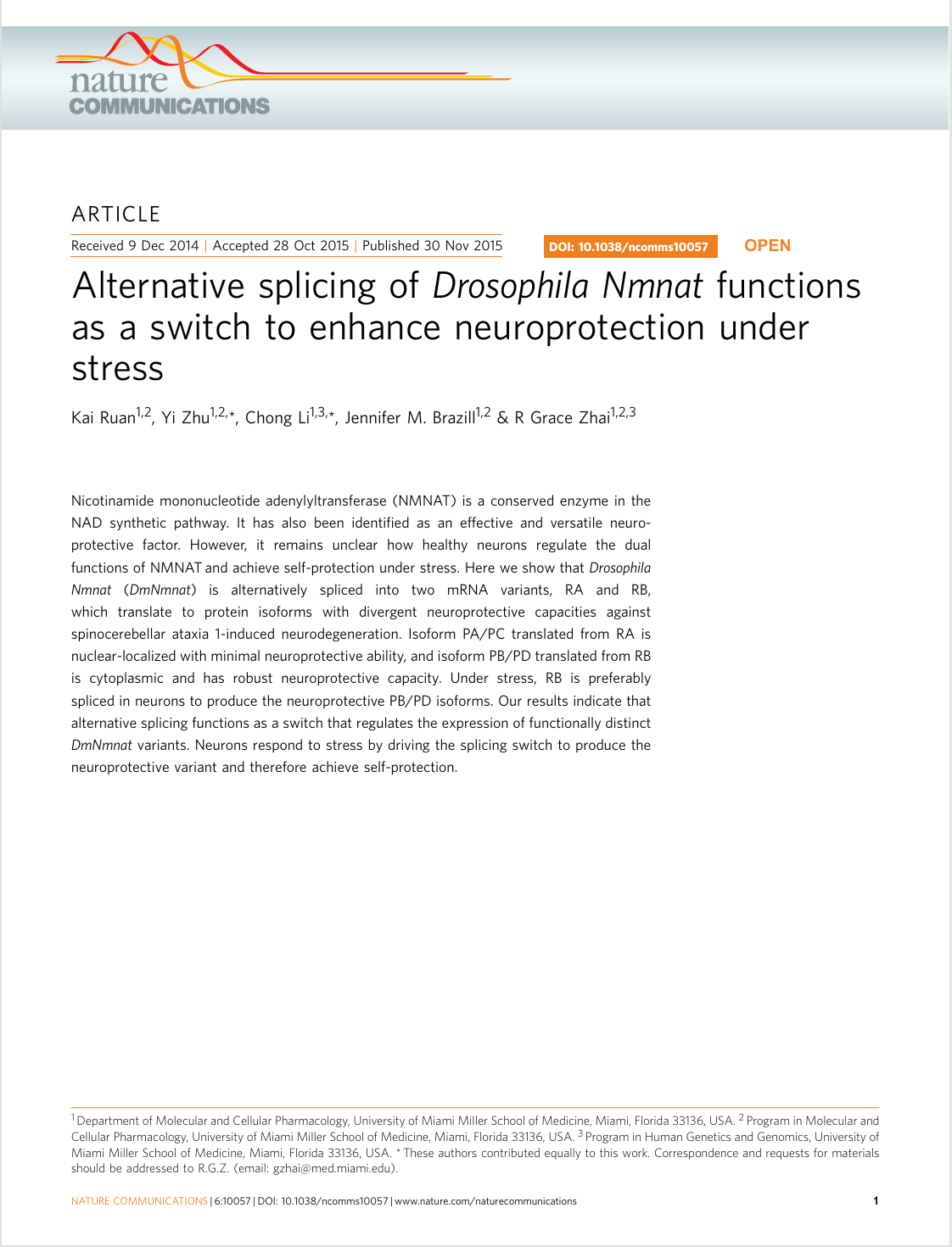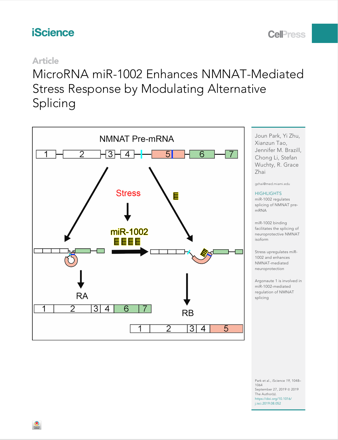 Park J, Zhu Y, Tao X, Brazill JM, Li C, Wuchty S, Zhai RG (2019) Microrna mir-1002 enhances Nmnat-mediated stress response by modulating alternative splicing. iScience, 19:1048-1064.