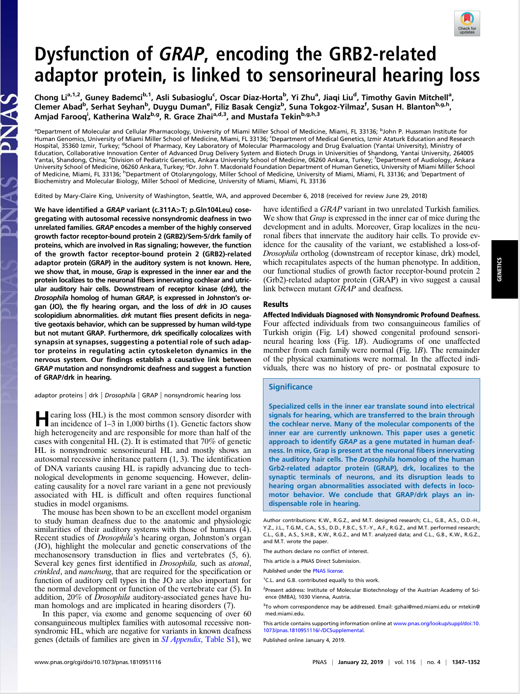Li C*, Bademci G*, Subasioglu A, Diaz-Horta O, Zhu Y, Liu J, Mitchell TG, Abad C, Seyhan S, Duman D, Cengiz FB, Tokgoz-Yilmaz S, Blanton SH, Farooq A, Walz K, Zhai RG, Tekin M (2019) Dysfunction of GRAP, encoding the GRB2-related adaptor protein, is linked to sensorineural hearing loss. (*equal contribution), PNAS, 116: 1347-1352